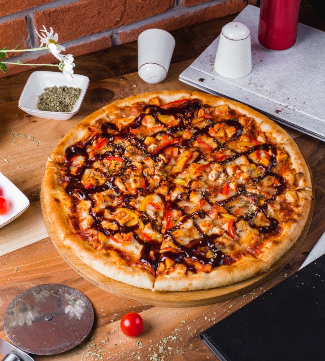 BBQ chicken, red onions, mixed peppers , BBQ sauce drizzle